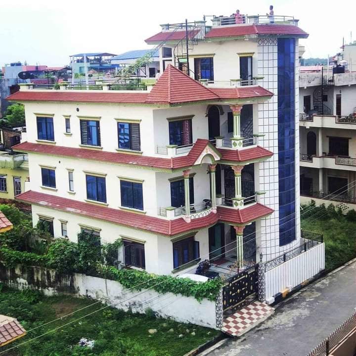 Residential 3.5 storey residential house on sale at Butwal, Devinagar, Rupandehi. This house is newly built-in 13.5 dhur. It has 12 bedrooms, 3 halls, 4 kitchens, and a dining. This house is suitable for residential purposes and is in a peaceful area. All kinds of facilities like water supply, electricity, garden, rental income, cable connection, and space for parking are available. The budget for this attractive house is Rs. 3.20 crore and slightly negotiable for immediate buyers. Interested people can contact the owner of this house for inspection and deal through the phone. 9847582134